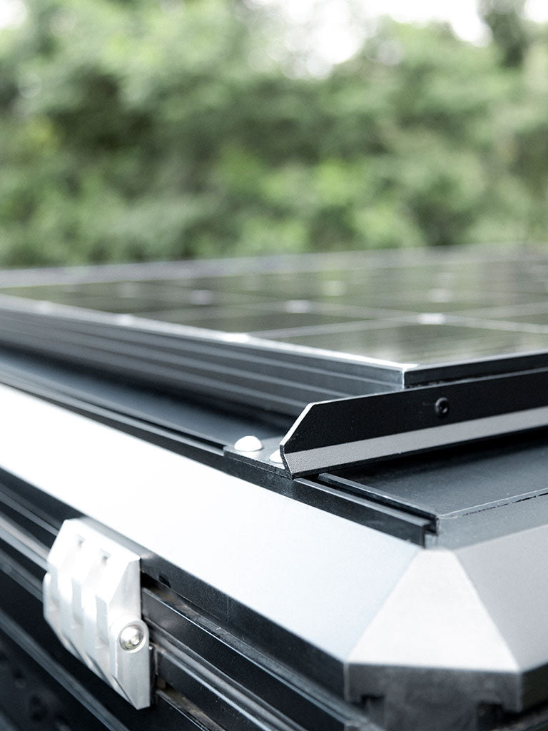 This top-notch 270 watt monocrystalline panel features a sleek black aluminium frame. Its A grade cells and anti-reflective textured glass make it exceptionally efficient. Plus, the black coating on the frame blends seamlessly with the LUXE series tents. Its compact shape also maximizes space on the tent's roof, leaving plenty of room for roof racks and other gear.